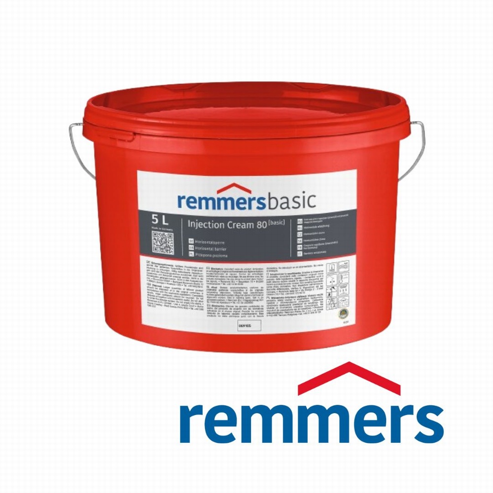 Remmers Injection Cream 80 (Basic) 5 L is a professional-grade waterproofing injection cream designed for effective treatment of rising damp, moisture penetration and damp walls in masonry structures. Ideal for use in cellars, basements, wall cavities and brickwork, this high-performance cream is specially formulated to penetrate porous building materials and create a “water repellent barrier” that prevents moisture movement and associated damage.<br>